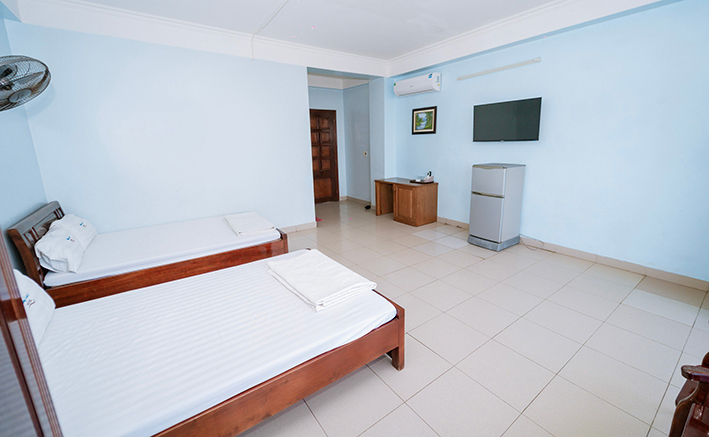 📢 Khách sạn được xây dựng với quy mô gồm 6 tầng với 36 phòng ngủ khép kín. Mỗi phòng có tiêu chuẩn 2 giường m6 vô cùng rộng rãi. Tất cả phòng ngủ có diện tích từ 25 – 30m2. Không gian phòng ngủ hiện đại, nội thất sang trọng với đầy đủ tiện nghi. Như tủ quần áo, bàn uống nước, tủ lạnh, máy sấy, ấm siêu tốc, bình nóng lạnh. Nhằm đáp ứng tốt nhu cầu sinh hoạt thiết yếu của quý khách.
